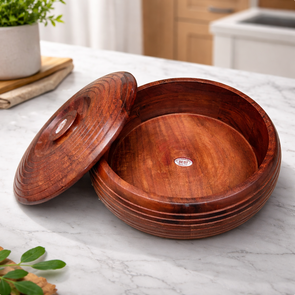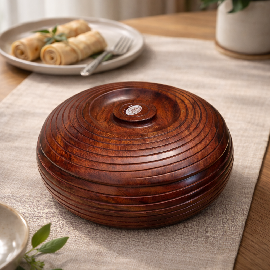 The natural wood helps regulate moisture, keeping rotis soft for longer without using plastic or chemicals. Its smooth finish, sturdy construction, and well-fitted lid ensure durability and long-term use.