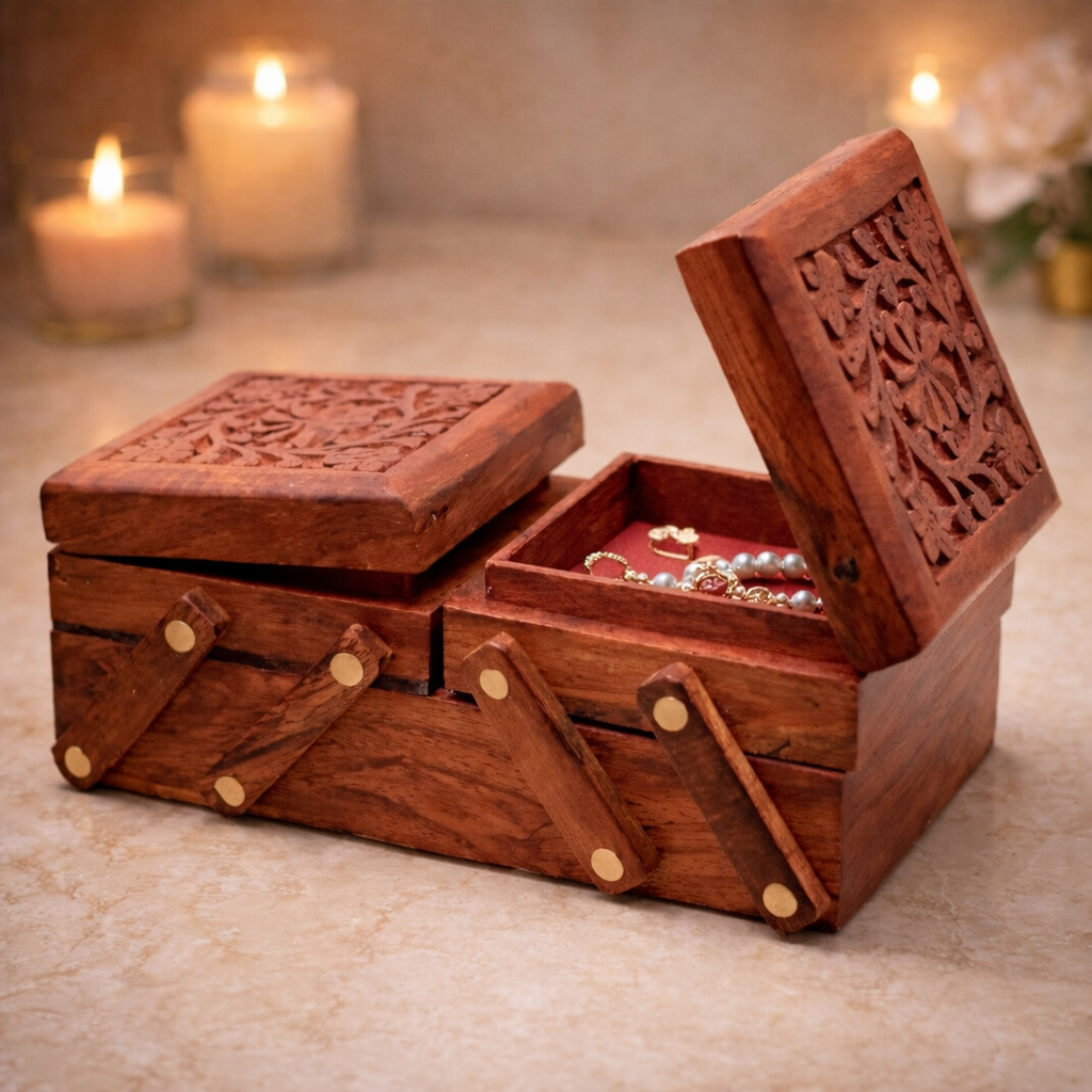Organize your precious jewelry in style with this beautifully handcrafted Sheesham Wood Flip Flap Jewellery Box. Designed with a unique 3-in-1 multi-layer structure.