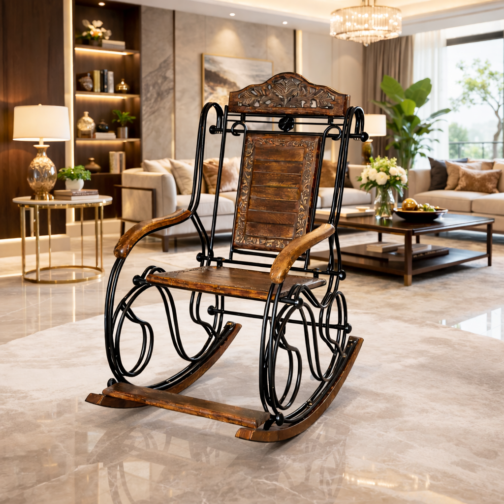 Experience timeless comfort and classic craftsmanship with the Wooden Twist Grandpa Rocking Chair, a beautifully handcrafted piece made from premium Solid Wood and supported by a sturdy iron base.